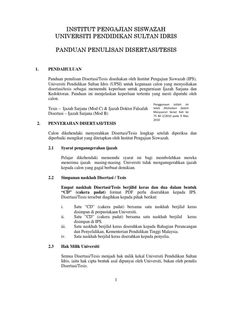 Panduan penulisan disertasi/tesis ini disediakan oleh institut pengajian siswazah (ips), universiti pendidikan sultan idris (upsi) sebagai panduan kepada . Pdf guidelines to dissertation thesis . Download format penulisan tesis di upsi download document. Buku garis panduan penulisan disertasi tesis 2015.